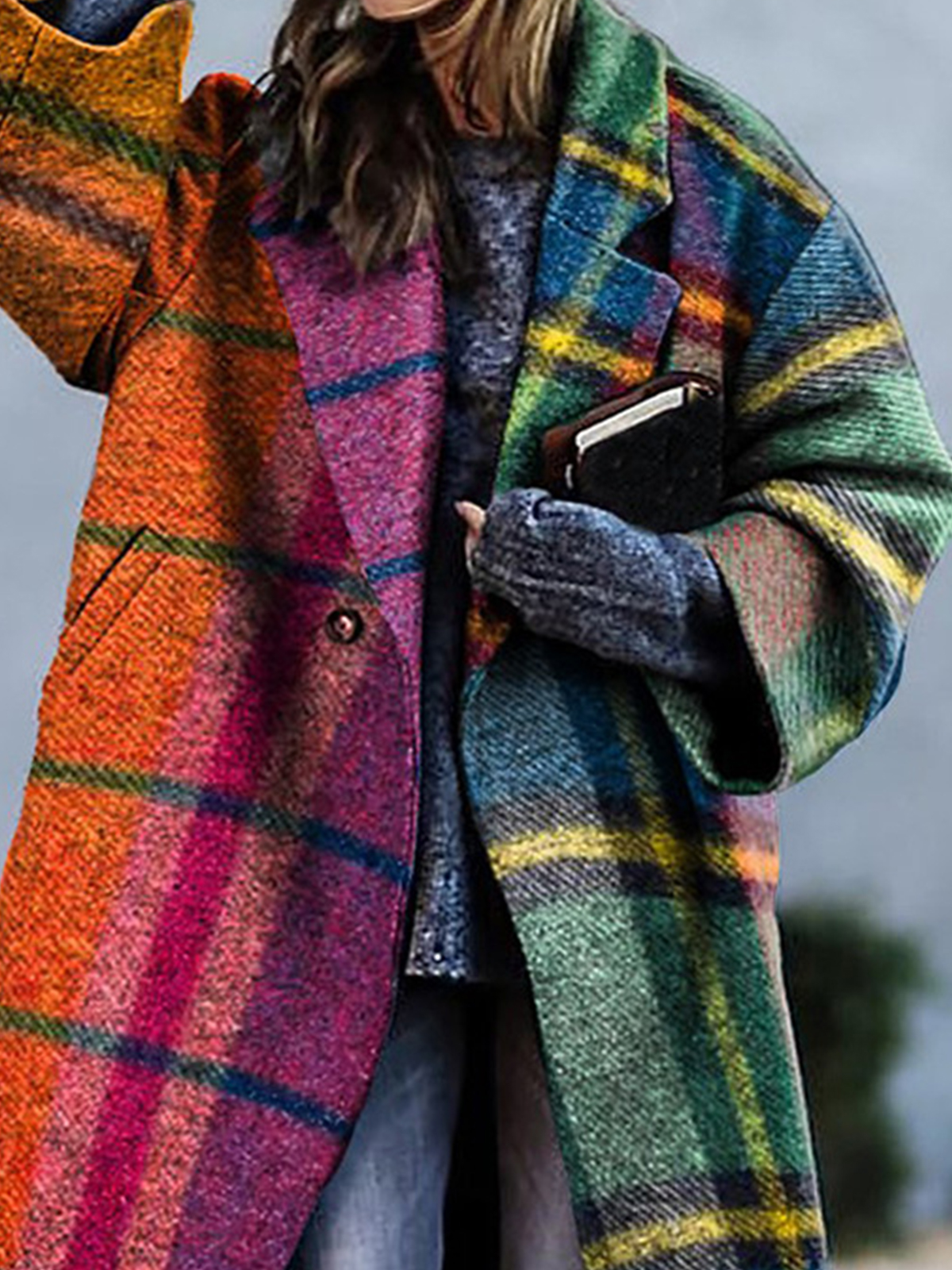 Women's Retro Colorful Plaid Print Thick Mid-Length Woolen Coat